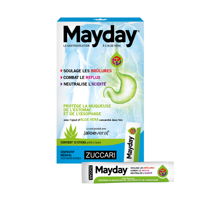 Mayday® exerce une action mécanique grâce à la présence d’un double concentré de pur jus d’Aloe vera, enrichi d’alginate de sodium, bicarbonate de sodium, carbonate de sodium et carbonate de calcium. La présence de bicarbonate de sodium et de carbonates de sodium et de calcium réduit également l’hyperacidité de l’estomac. Les polysaccharides naturellement présents dans le pur jus d’Aloe vera protègent les muqueuses en adhérant aux parois de l’œsophage et de l’estomac et en formant un film protecteur capable de défendre les tissus contre les sucs gastriques ou les agents irritants. Les vertus du double concentré de jus pur d’Aloe vera s’ajoutent à celles de l’alginate de sodium qui, au contact de l’acidité de l’estomac, réagit en formant un gel. Le gel emprisonne les bulles de dioxyde de carbone libérées par les carbonates contenus dans la formulation et forme une barrière dans la partie supérieure de l’estomac qui empêche mécaniquement les sucs gastriques de remonter dans l’œsophage. Le produit ne contient pas d’eau comme diluant car elle est complètement remplacée par du pur jus d’Aloe vera non pasteurisé, non filtré au charbon et doublement concentré selon le procédé exclusif ReversOsmose®.